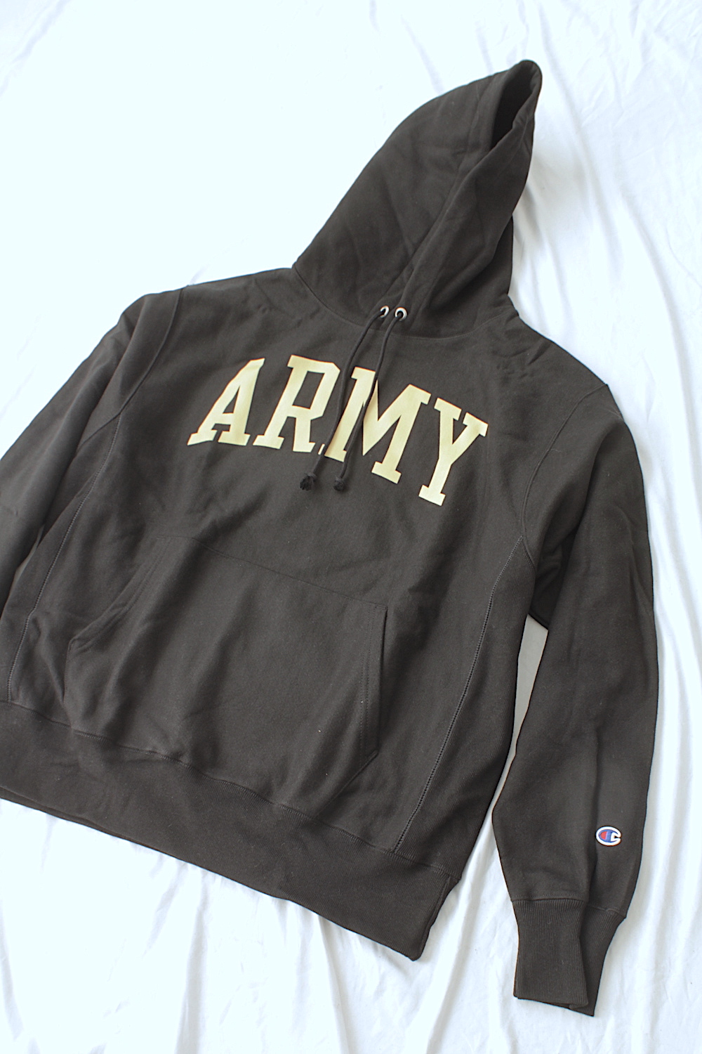 アメリカにて買い付けられたチャンピオンの現行モデルでヴィンテージでは非常に高値で取引されるARMYのプリントが施された現地でオフィシャルで展開されるリバースウィーブパーカーが届きました。