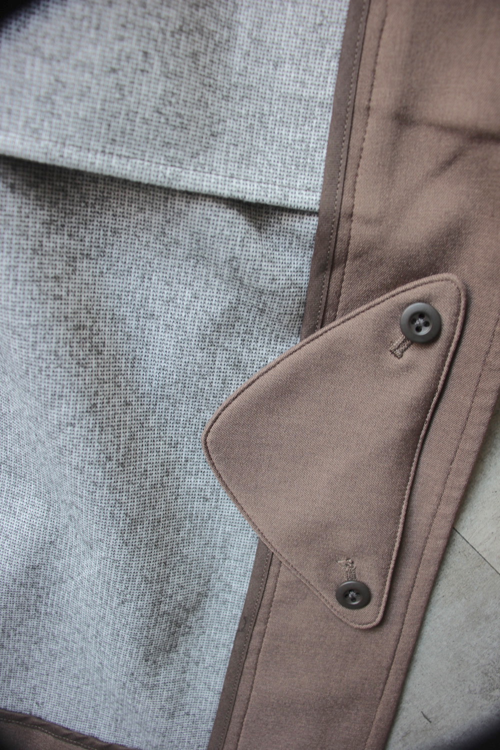 コートの裾についているフラップを外して衿に装着すれば立てることが出来る仕様。