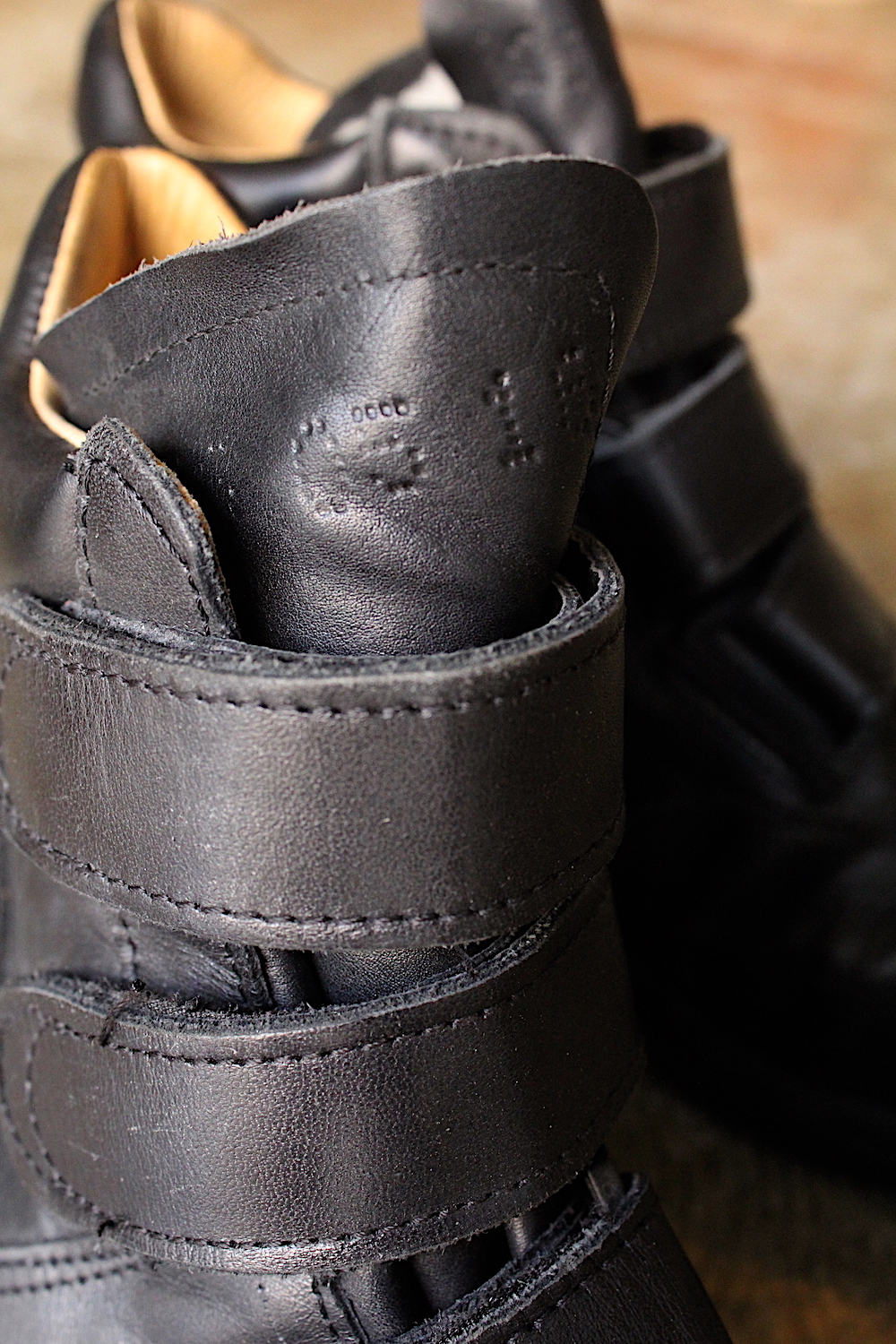 高級感あるブラックレザーとスエードのコンビ素材で、ベルクロのハイカットと非常に雰囲気のあるシューズ。